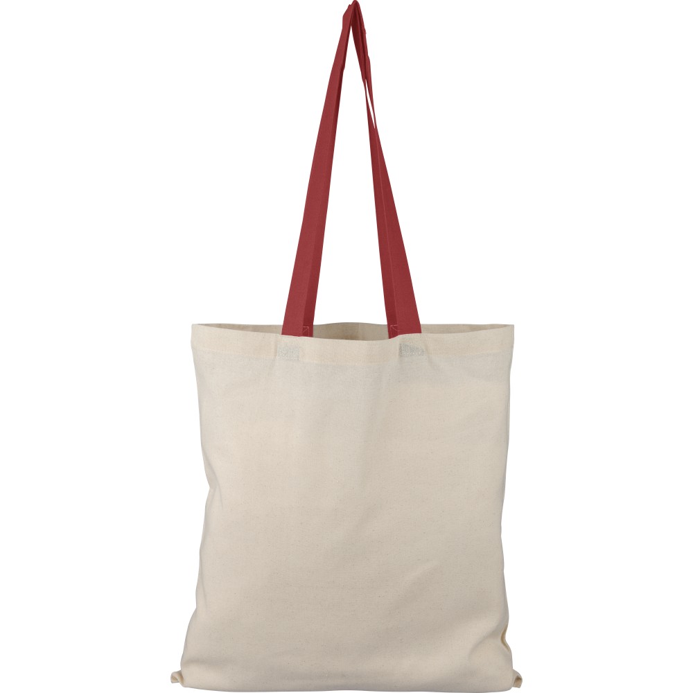 Oeko-Tex minősítésű, 140 g/m2 pamutból készült bevásárlótáska natúr színben, színes fülekkel. Mérete 38 × 42 cm, a fülek hossza 70 cm, szélessége 2,5 cm. Oeko-Tex címkével ellátva.