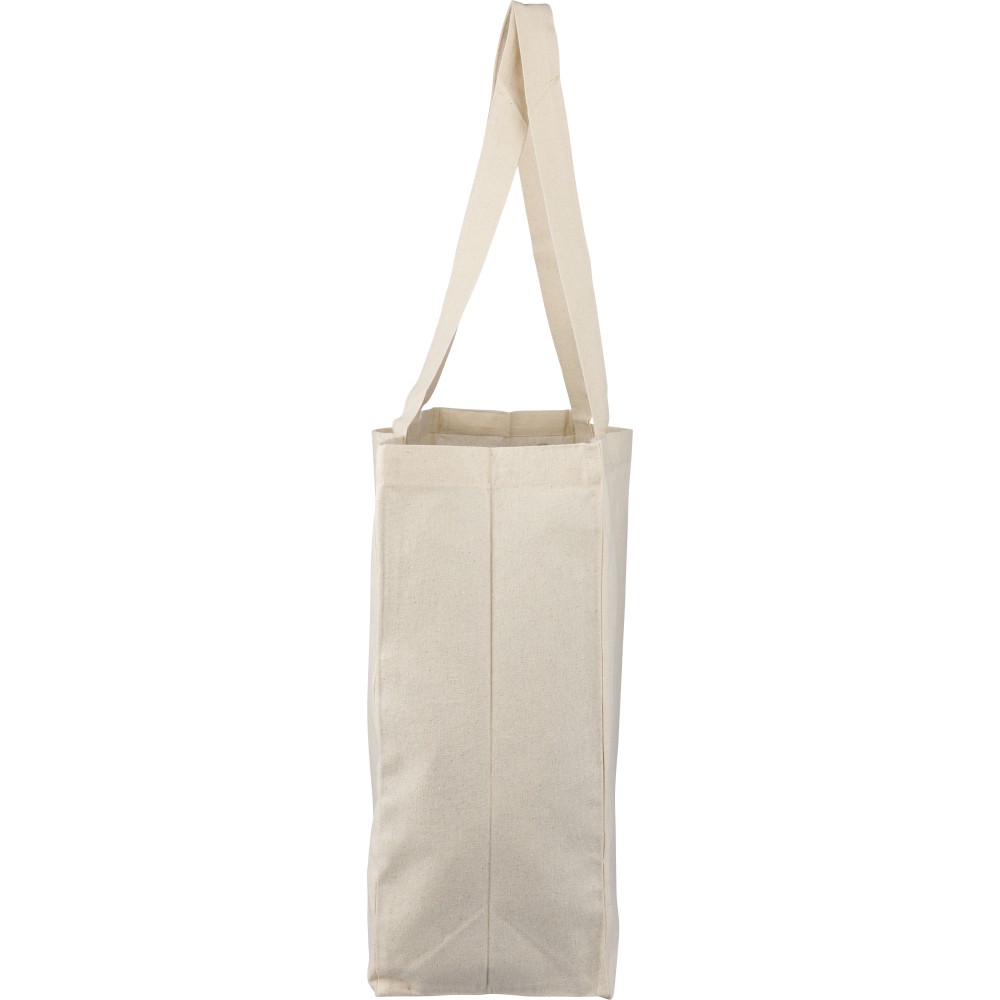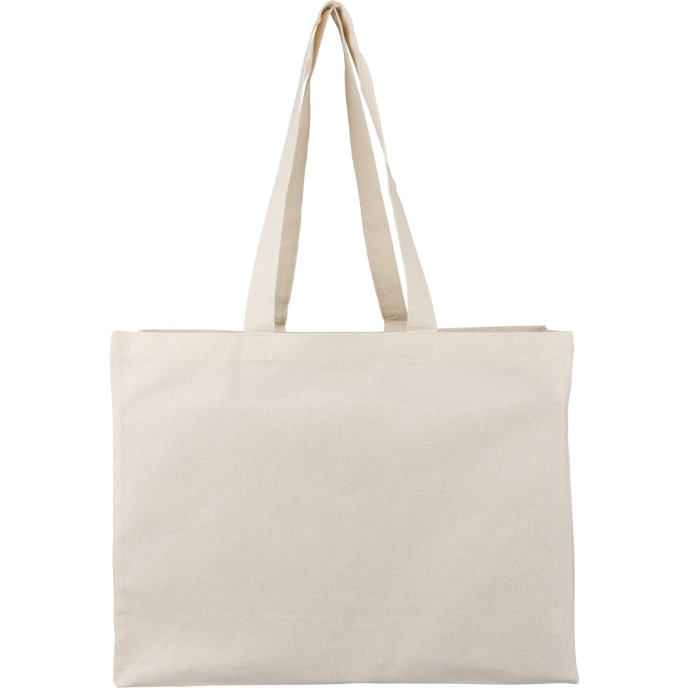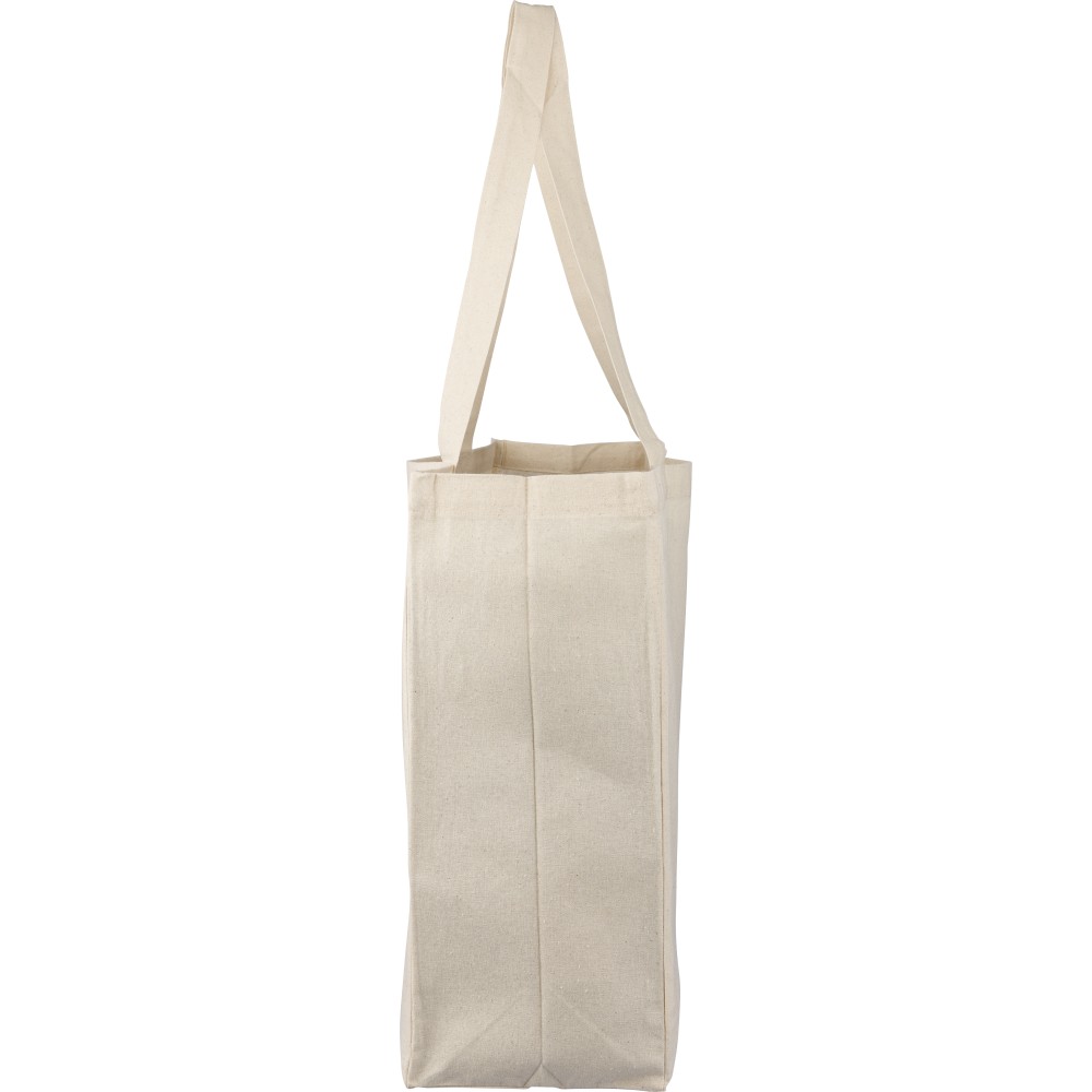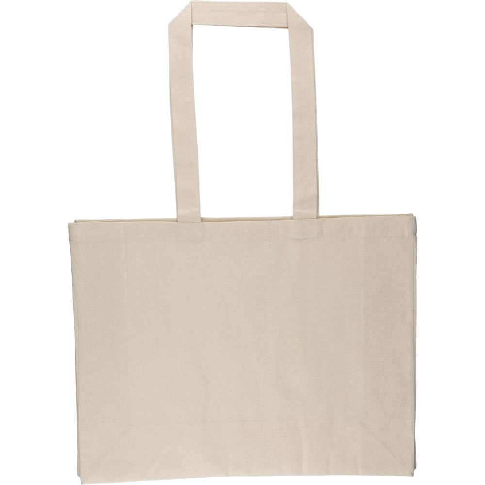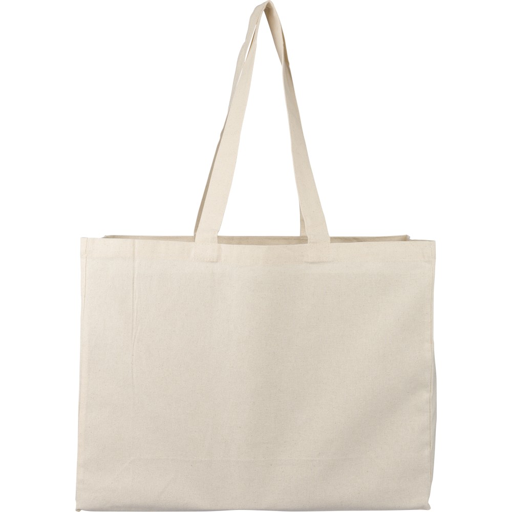 Oeko-Tex minősítésű, 180 g/m2 pamutból készült natúr színű bevásárlótáska D-alakú talppal, 43 × 34 × 13 cm méretben, 67 cm hosszúságú és 3 cm szélességű fülekkel. Oeko-Tex címkével ellátva.