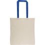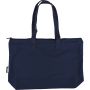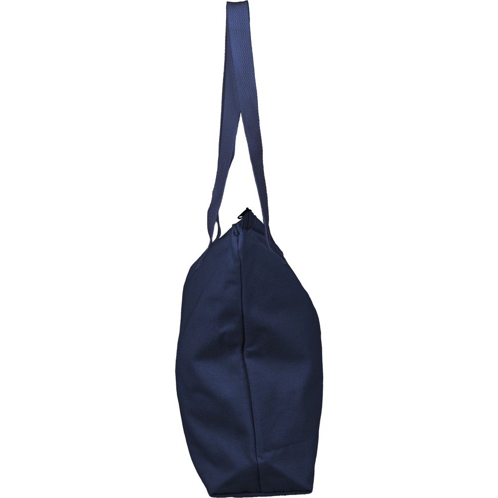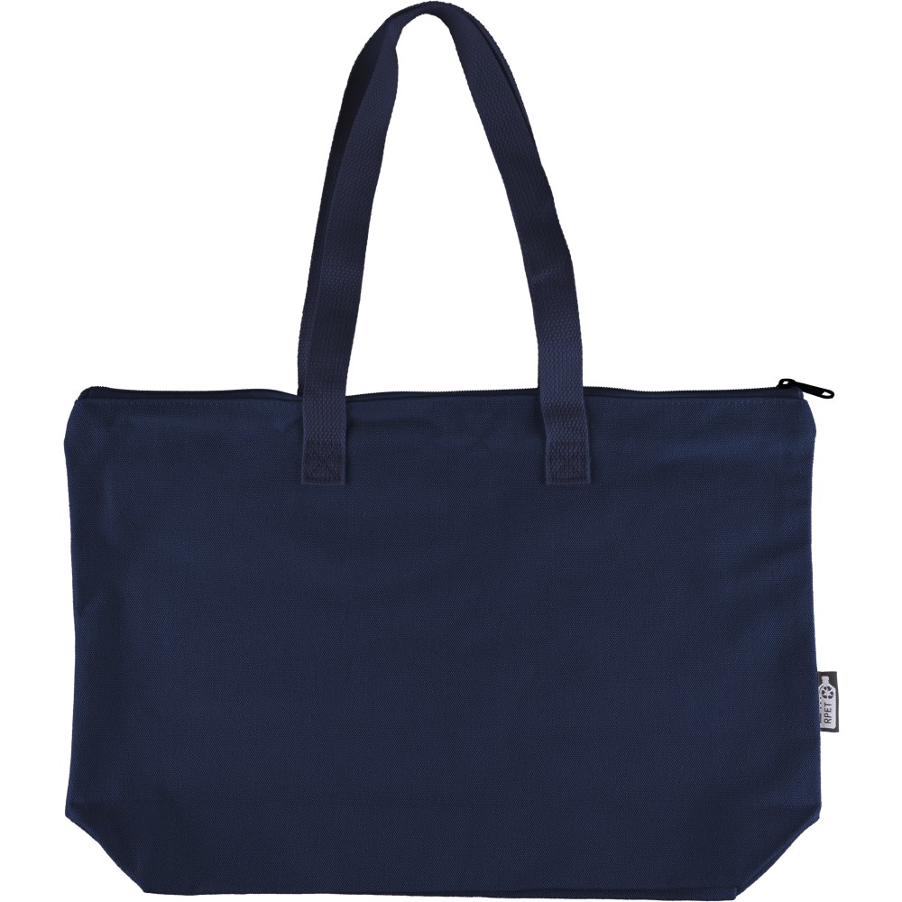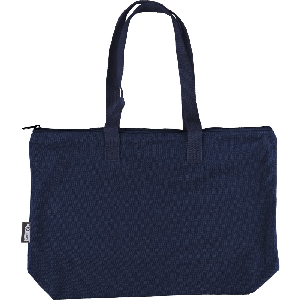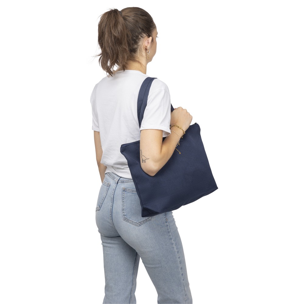 Újrahasznosított pamut-poliészter, 330 g/m2 kevertszövetből készült bevásárlótáska nagy, cipzáras felső rekesszel, 65 cm hosszúságú és 2,5 cm szélességű hosszú fülekkel, a táska színével harmonizáló hevederrel. Külső felületén rPET címkével, belső részén további címkével ellátva.