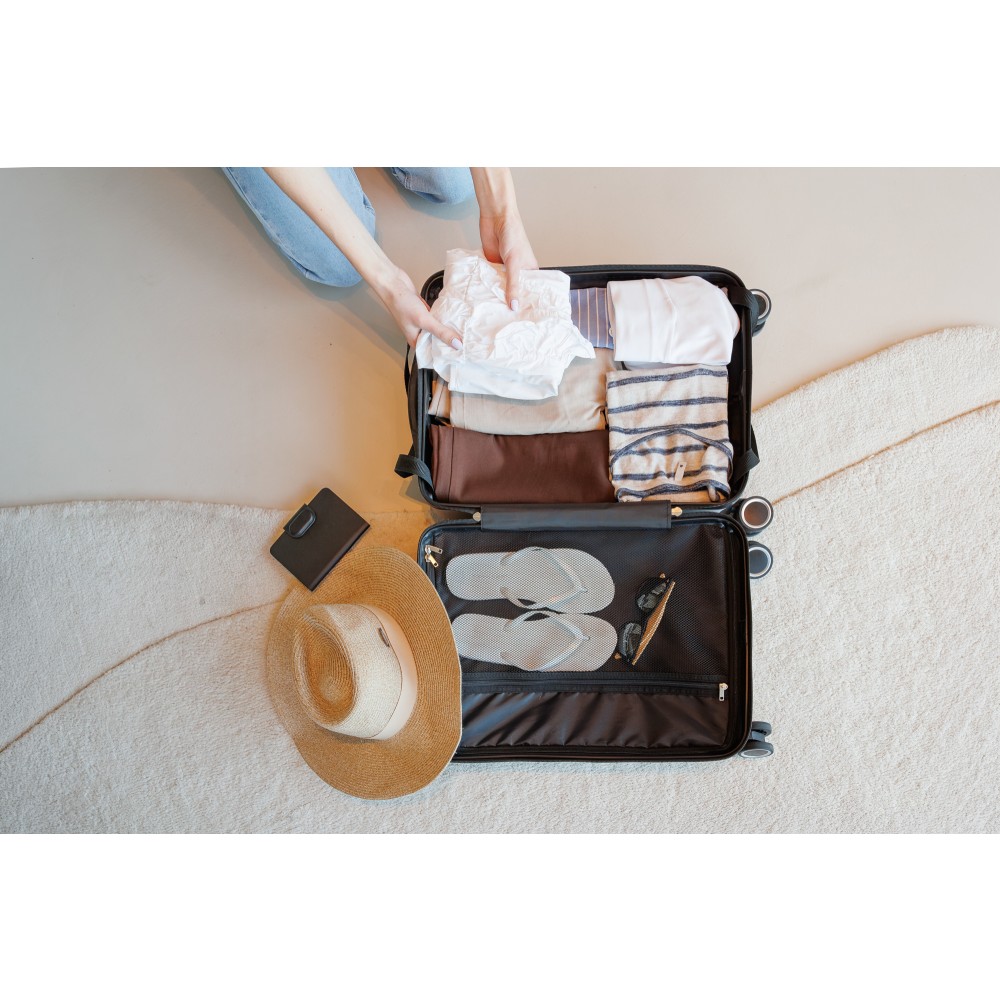 Keményfedeles ABS gurulós bőrönd 8 kerékkel (4x2), és háromszintű fém fogantyúrendszerrel. Felső műanyag fogantyút, számkombinációs zárat és 3M ragasztócsíkkal rögzíthető gravírozható táblát tartalmaz. A belső bélés anyaga 210D, a táskán belül 3 rekesz áll rendelkezésre: U-cipzáras zseb, hálós zseb és X-alakú, csattal záródó gumis heveder. Űrtartalom: 30 liter. Csomagolása barna papírdoboz.