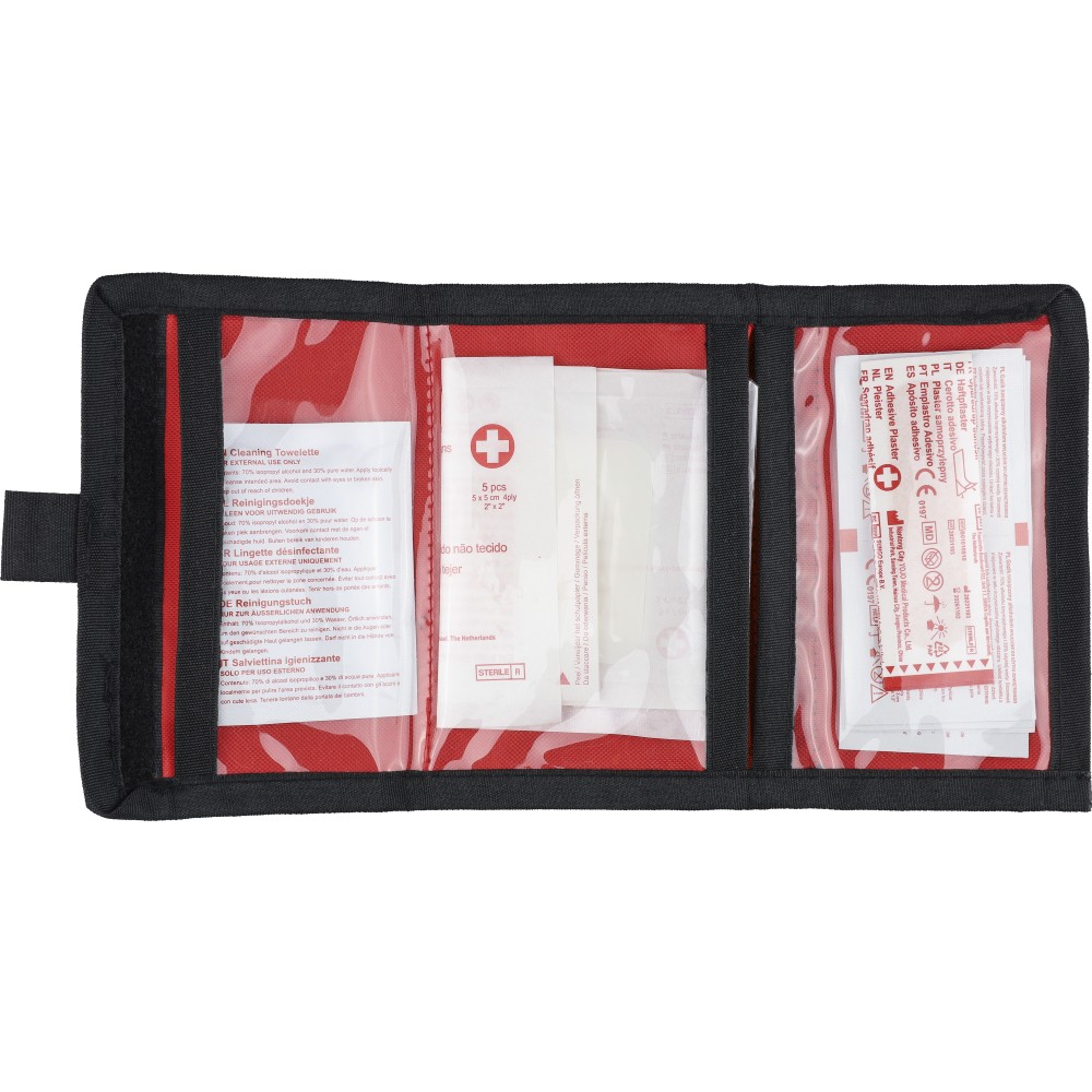 RPET 600D poliészterből készült elsősegélytasak tépőzárral és hordozópánttal. Tartalma: 5 sebtapasz, 1 steril fedőkötés, 1 nemszőtt törlőkendő, 8 alkoholos törlőkendő és 2 tisztítókendő. A külső felületen rPET címke található.