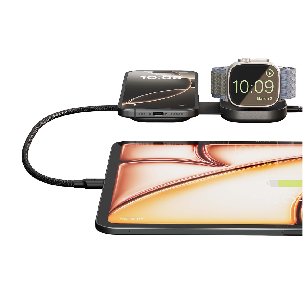 Ez az intelligens, 3 az 1-ben USB-C Pro 3 töltőkábel MacBook laptopok és egyéb USB-C eszközök tápellátását biztosítja, miközben egyidejűleg iPhone (12+), AirPods és Apple Watch készülékek vezeték nélküli töltésére is alkalmas. Az eszköz támogatja az akár 140W-os USB-C Power Delivery technológiát, a Qi2-tanúsítvánnyal rendelkező 15W-os gyors vezeték nélküli töltést, valamint az Apple Watch 5W-os teljesítményű töltését. A prémium alumíniumból készült, kompakt és összecsukható kialakítás praktikus megoldást nyújt ingázáshoz, hibrid munkavégzéshez és utazáshoz egyaránt. Az optimális teljesítmény elérése érdekében legalább 65W-os, de javasoltan 140W-os USB-C adapterrel használható.