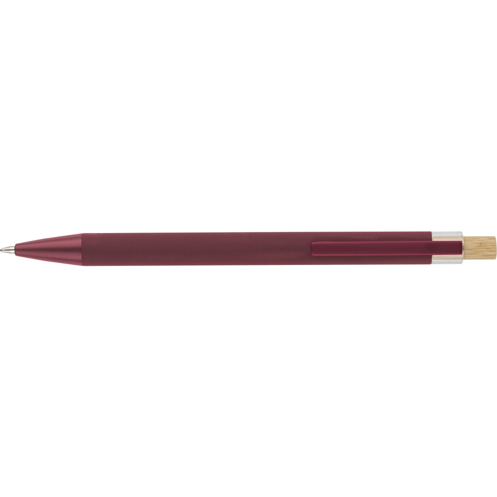 Újrahasznosított alumíniumból készült golyóstoll bambusz nyomógombbal és AS műanyag díszítéssel, fém klippel és a toll színével harmonizáló műanyag tollheggyel. A tolltesten lézergravírozott recycled (újrahasznosított) alapanyagra utaló logó található. Megközelítőleg 800 méter íráshosszúságú, kék színű tollbetéttel.