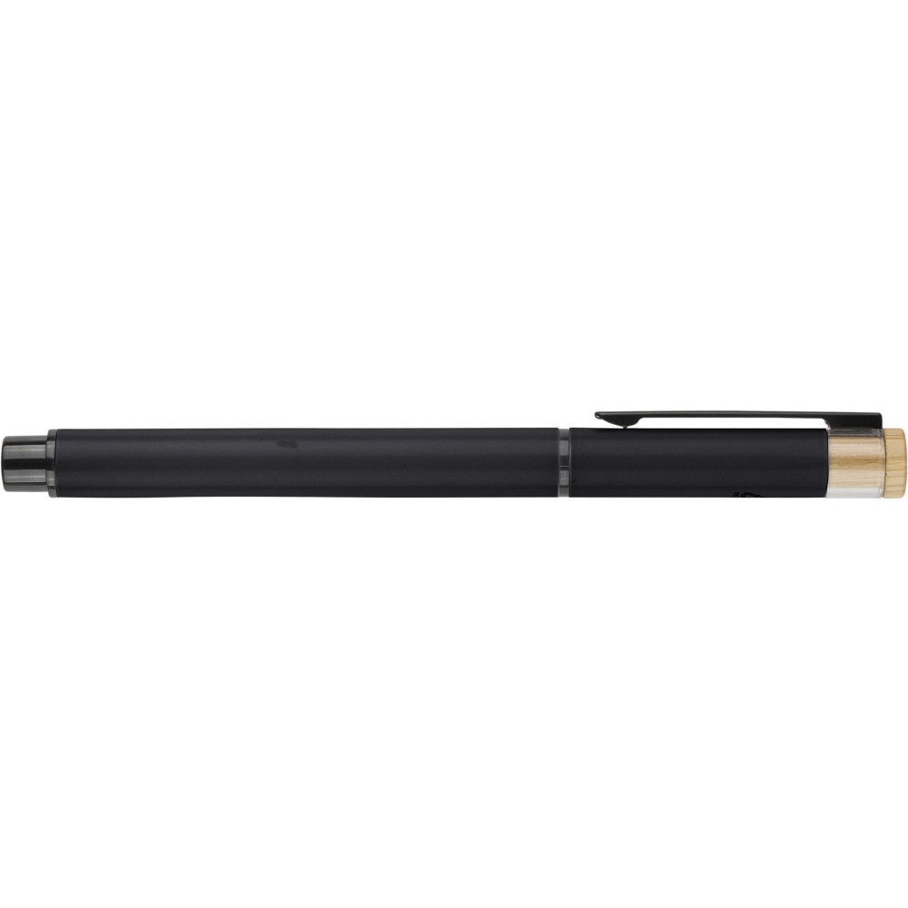 Újrahasznosított alumíniumból készült, lakkozott tollszett golyóstollal és rollerball tollal. A golyóstoll bambusz nyomógombbal, rPET díszítéssel és fém klippel rendelkezik, míg a rollerball toll bambusz/rPET kupakdíszítéssel és hozzá illeszkedő klippel. A tolltesten gravírozott recycled (újrahasznosított) alapanyagra utaló logó található mindkét toll esetében. A golyóstoll kb. 700 méter, a roller toll kb. 500 méter íráskapacitású, mindkettő kék színű tollbetéttel. Színes, újrahasznosított kartonból készült ajándékdobozba csomagolva.