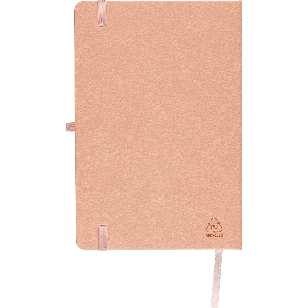 A5-ös jegyzetfüzet újrahasznosított kemény PU borítóval, a hátoldalán dombornyomott újrahasznosított logóval. Tartós és rugalmas anyagból készült, amely kényelmes fogást, párnázottságot és hosszan tartó használatot biztosít. A borító lézergravírozásra alkalmas, amely során finom, tone-on-tone (színazonos) hatás érhető el. 80 vonalas, 70 g/m2 súlyú lapot tartalmaz, színben illeszkedő gumírozott rögzítőpánttal, könyvjelző szalaggal és tolltartó hurokkal. A füzetben használt papír FSC Mix tanúsítvánnyal rendelkezik.