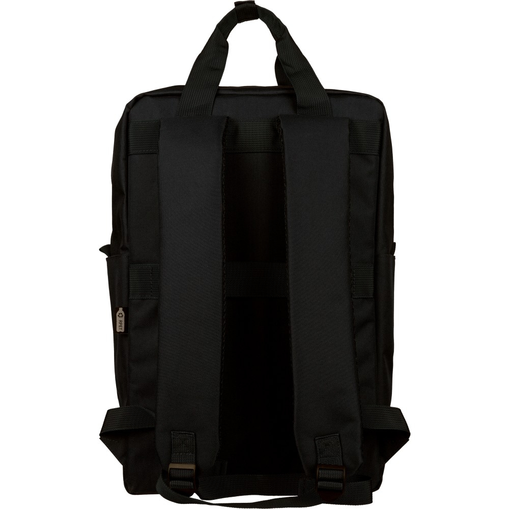 Újrahasznosított 900D poliészterből készült hátizsák, 210D béléssel és rPET címkével. Tágas fő rekesszel rendelkezik, 16?-os laptop számára kialakított külön zsebbel, elülső rekesszel, két oldalzsebbel, valamint bőröndre rögzíthető pánttal (trolley strap). Felső fogantyúi gombbal összefoghatóak, vállpántjai szellőző kialakításúak a kényelmes viselet érdekében.