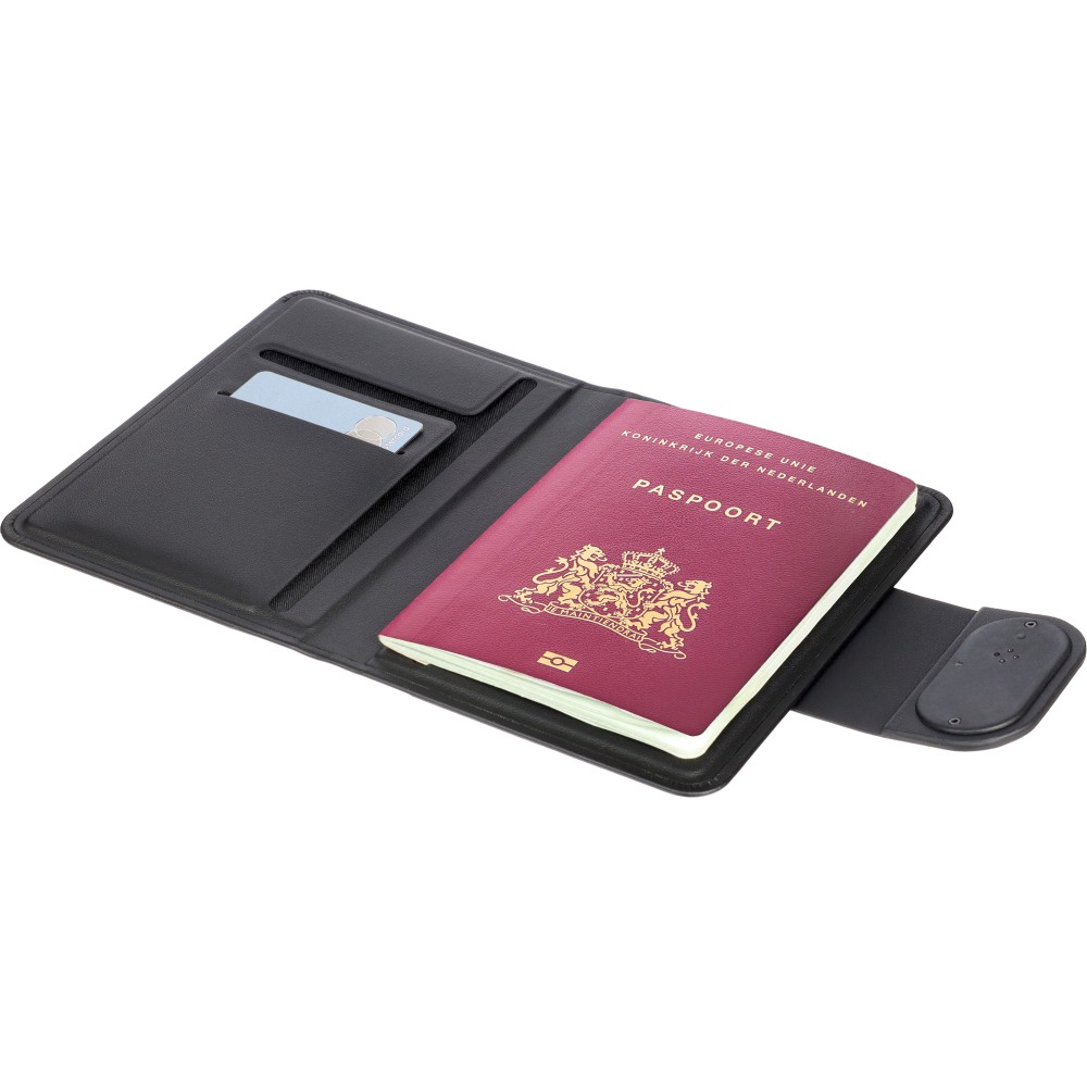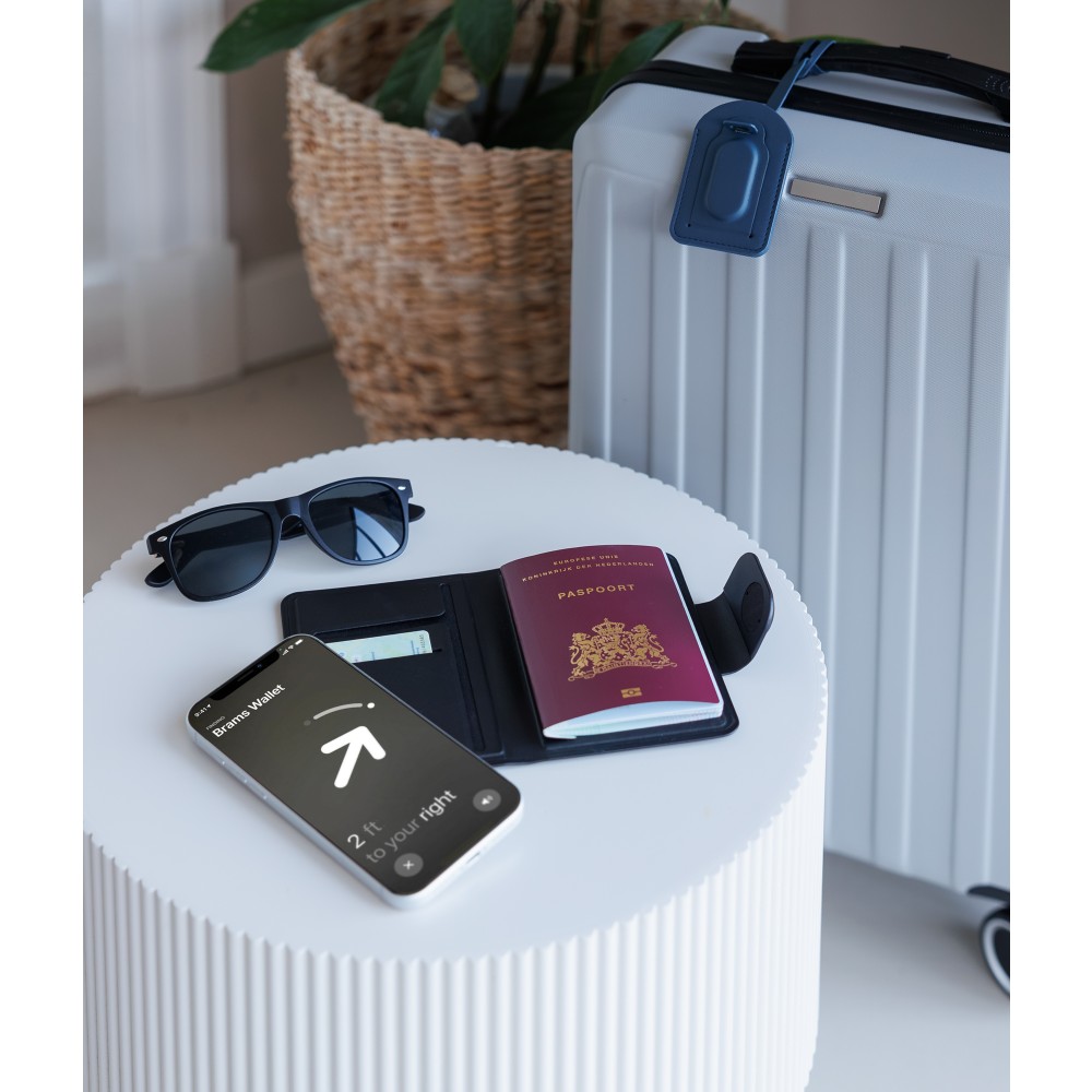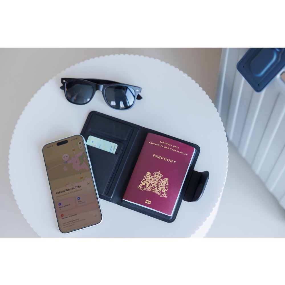 Keményfedeles útlevéltartó mágneses zárral és a fedélbe épített nyomkövetővel, amely kompatibilis az Apple FindMy és az Android FindHub hálózatokkal. Három belső rekesszel rendelkezik az okmányok és kártyák számára. Újrahasznosított anyagból (PU) készült. Egyenként kraftpapír dobozba csomagolva.