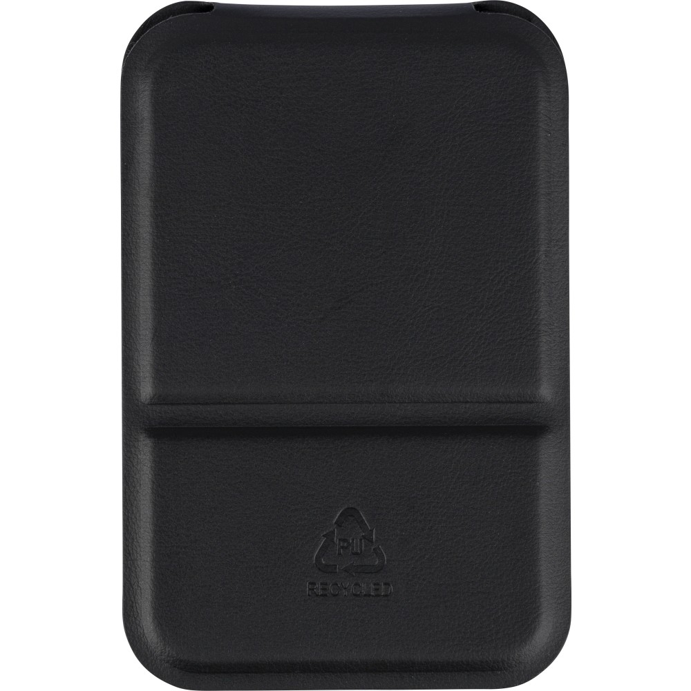 Üvegtükör összehajtható, újrahasznosított PU borítással, amely kinyitva álló helyzetben használható. A borításon dombornyomott, újrahasznosított alapanyagra utaló logó található. Papírtasakba csomagolva.