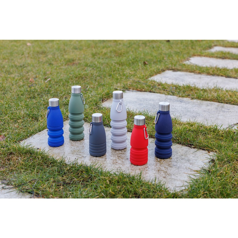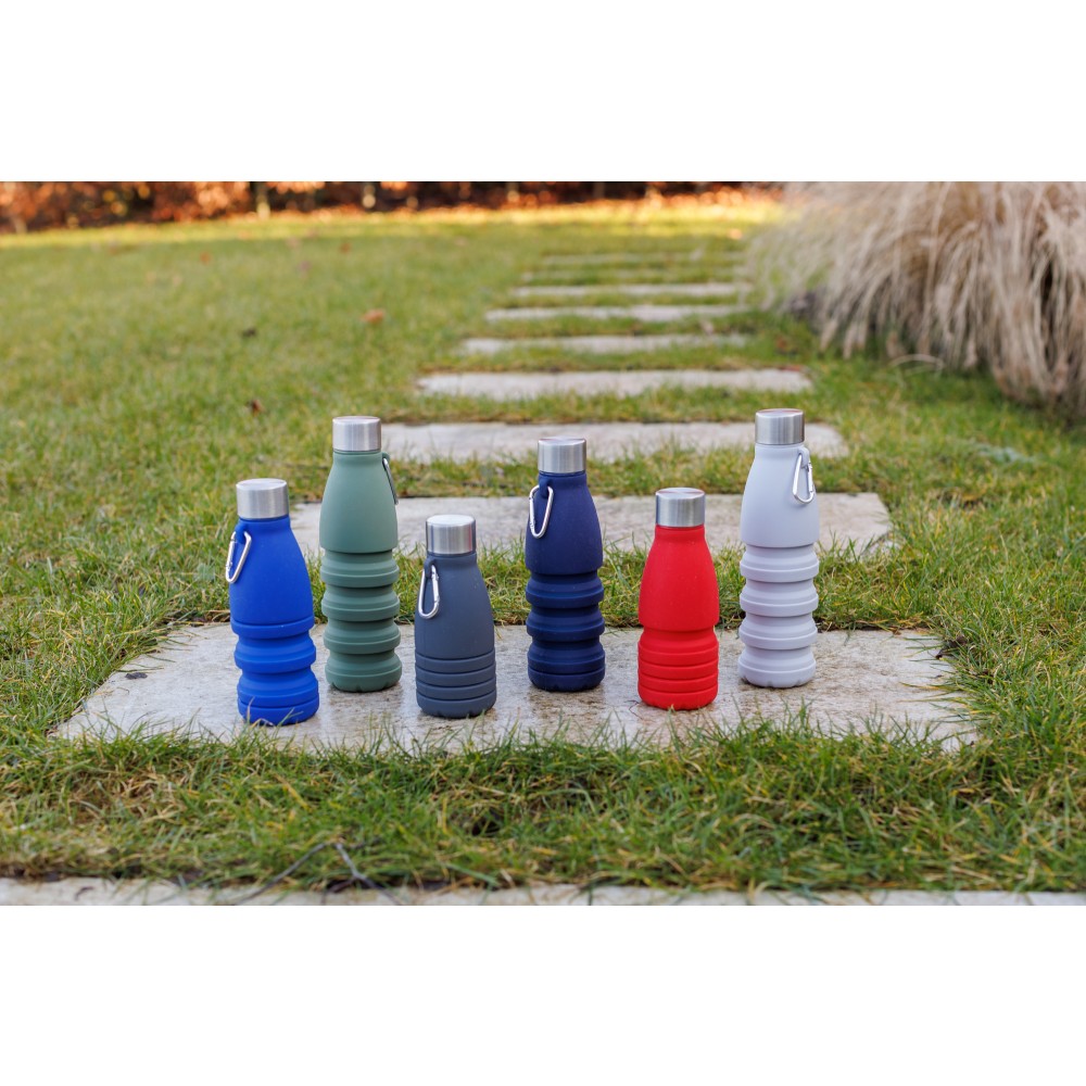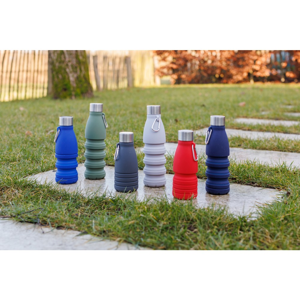 Összecsukható palack rozsdamentes acél fedéllel és alumínium karabinerrel. Összecsukott méret: d: 7x17 cm, kinyitott méret: d: 7x25 cm. Nincs egyenként csomagolva. Anyaga: szilikon. Űrtartalom: 550 ml.
