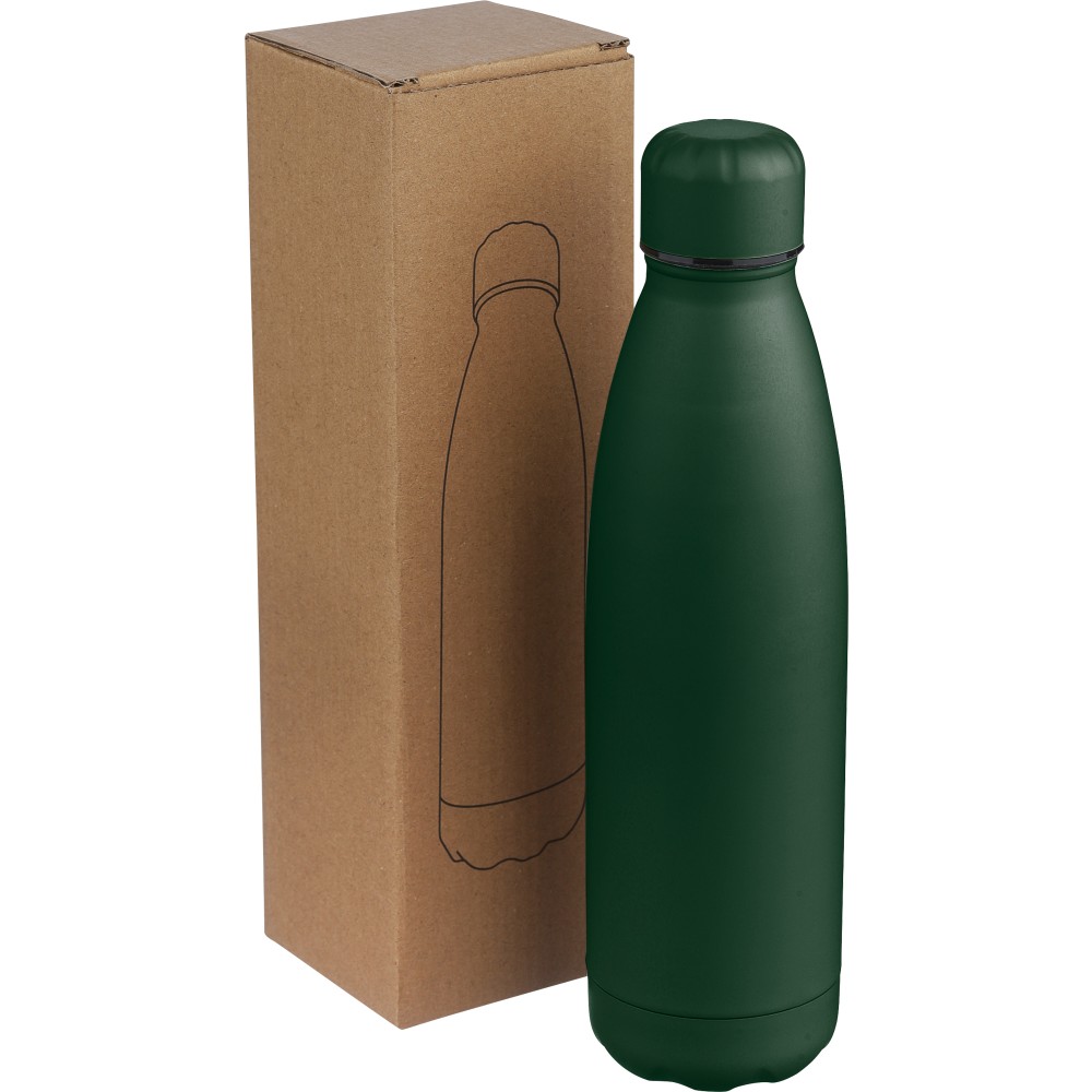 Újrahasznosított rozsdamentes acél ivópalack 500 ml-es űrtartalommal. Duplafalú szigetelés, amely akár 12 órán át melegen vagy hidegen tartja az italokat. A 304-es rozsdamentes acél belső kiváló tartósságot, rozsdaállóságot és biztonságos élelmiszer-érintkezést garantál. Selymes matt színű felülettel. A csavaros fedél és az aljzat színben egyezik a tiszta, egységes megjelenés érdekében. A palack elülső részén gravírozott újrahasznosított logó található. Egyenként, barna kartondobozba csomagolva.