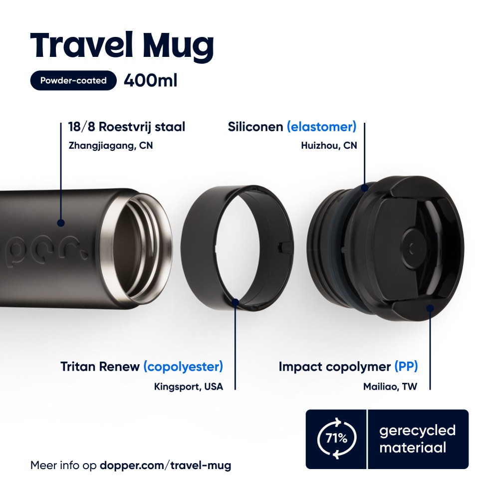 Reggeli koffeinlöket, napközbeni hidratálás vagy esti frissítő pezsgés ? ez a Dopper Travel Mug mindenre készen áll, bárhová is tartasz. Gőzölgően melegen tartja a forró italokat, hűvösen a hidegeket, és megőrzi a szénsavas italok buborékait is. Nincs szivárgás, nincs macera, nincs súlyfelesleg ? és határozottan nincs egyszer használatos hulladék. Könnyen nyitható, lepattintható kupakkal rendelkezik; az italokat akár 6 órán át melegen, 20 órán át pedig hidegen tartja. Duplafalú, 90%-ban újrahasznosított rozsdamentes acélból készült, tartós bevonattal ellátva. Mosogatógépben (emblémázás nélkül nélkül) 65 °C-ig mosható. Kávé vagy tea használata esetén elszíneződés vagy szagmaradvány előfordulhat. Forró folyadékok esetén fokozott óvatossággal használja!