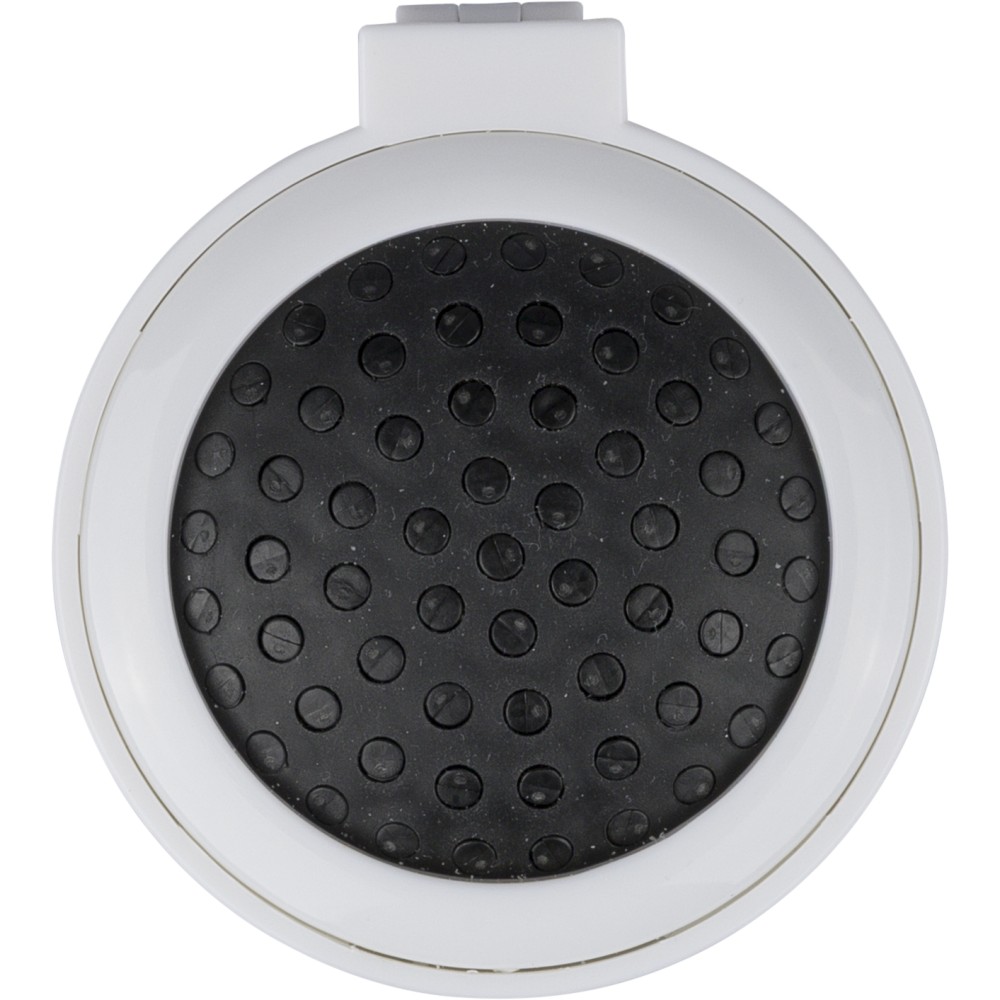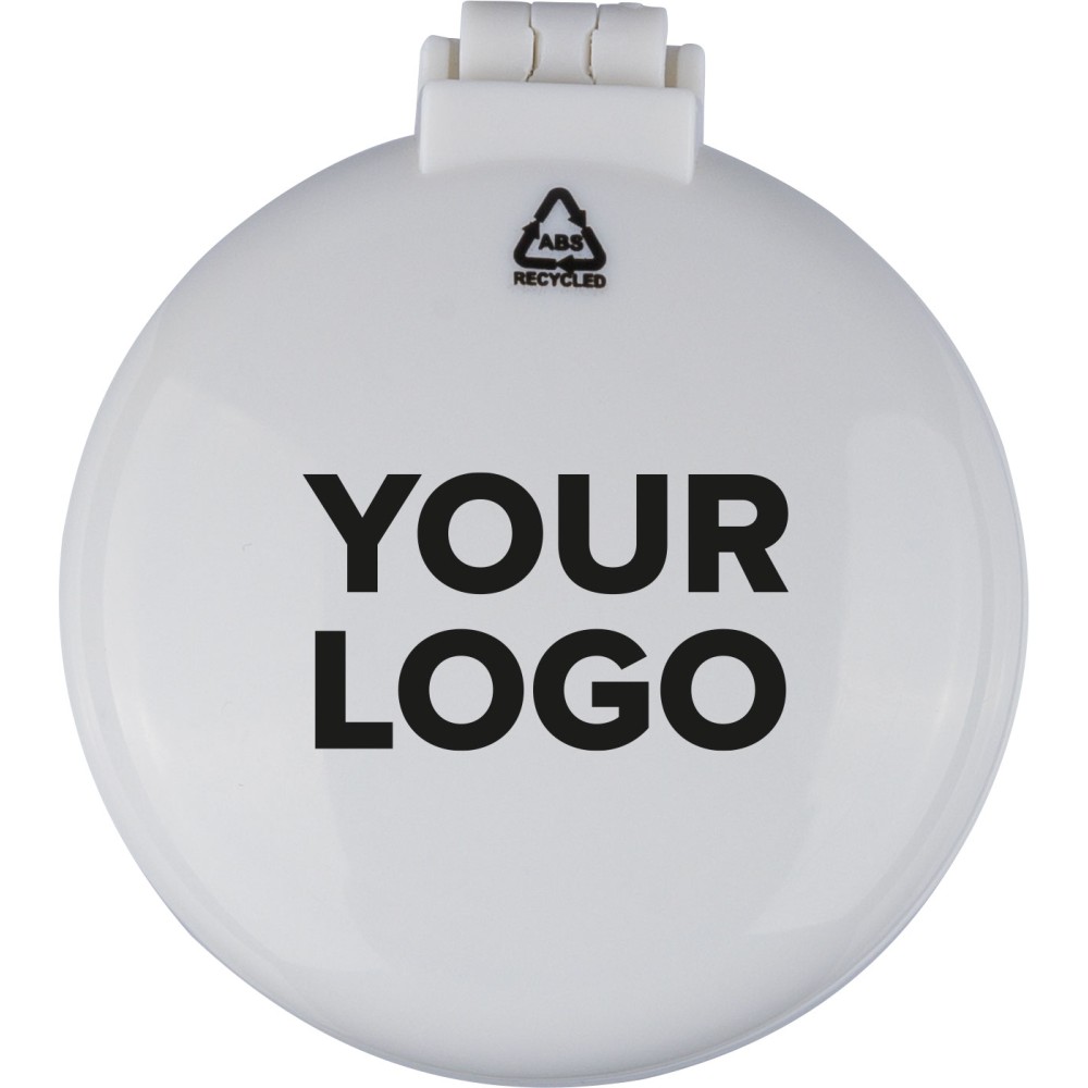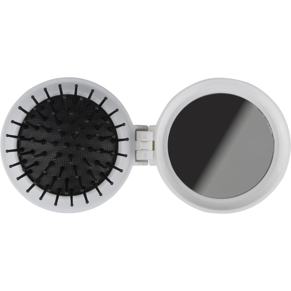 Újrahasznosított ABS-ből hajkefe és tükör, praktikus kialakítású útközbeni használatra, a terméken újrahasznosított alapanyagra utaló megjelölés található.