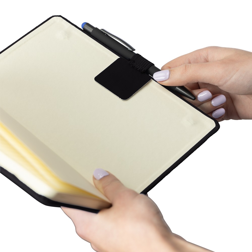 Tolltartó hurok rugalmas gyűrűvel és öntapadós hátoldallal, amelyet tollak vagy ceruzák biztonságos rögzítésére terveztek. Tartós és rugalmas anyagból (PU) készült. Az öntapadós hátoldal lehetővé teszi a könnyű rögzítést jegyzetfüzetek, határidőnaplók vagy mappák belső borítójára. Praktikus kiegészítő, melynek segítségével az íróeszközök rendben tarthatóak és könnyen hozzáférhetőek.