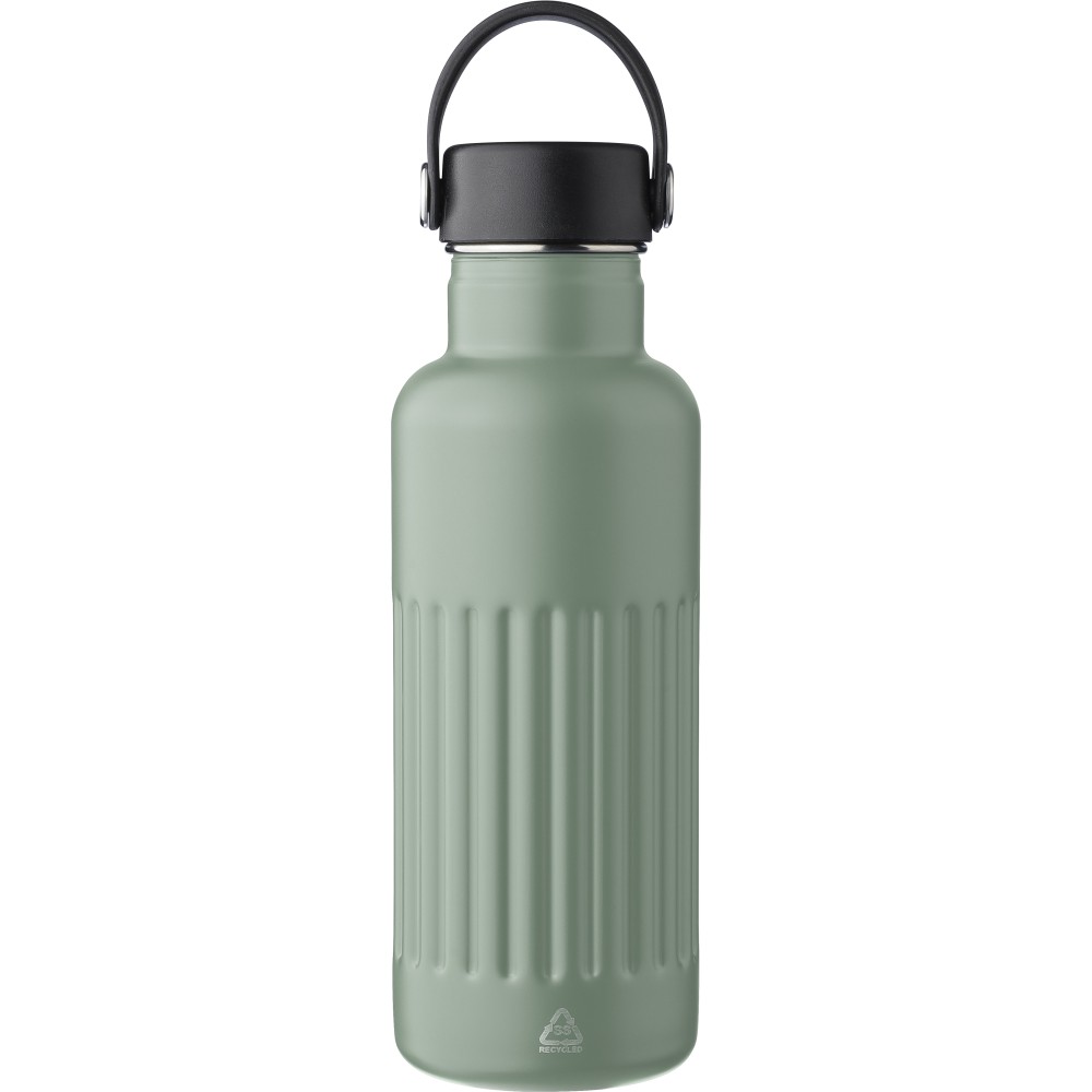 Újrahasznosított rozsdamentes acélból készült, duplafalú ivópalack 500 ml űrtartalommal. Belső része 304-es, külső része 201-es rozsdamentes acél bordázott felülettel. PP és vas kombinációjú kupakkal rendelkezik, TPE hordozópánttal a könnyű szállításhoz. A palacktesten gravírozott recycled (újrahasznosított) alapanyagra utaló logó található. Darabonként barna kartondobozba csomagolva.